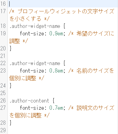 <code>/* プロフィールウィジェットの文字サイズを小さくする */