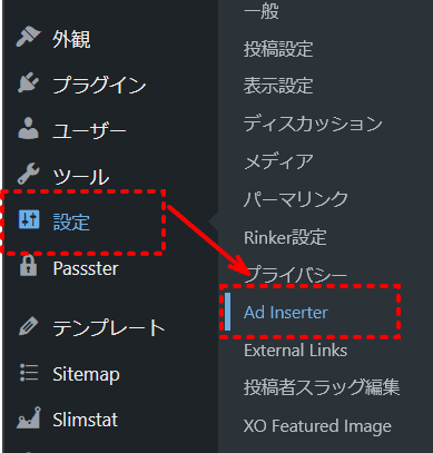 インストールするとサイドメニューの設定に進むと、Ad Inserter が表示されます。