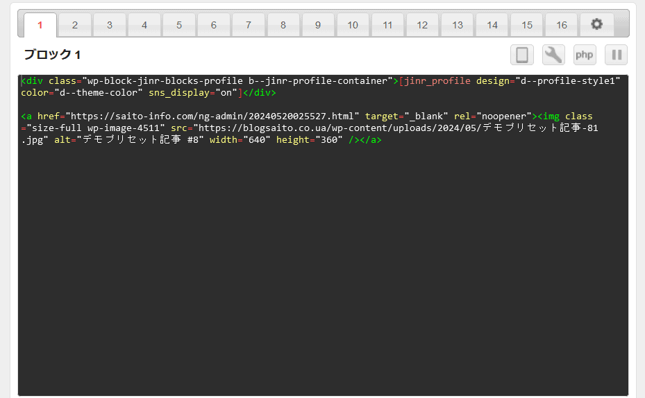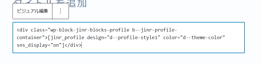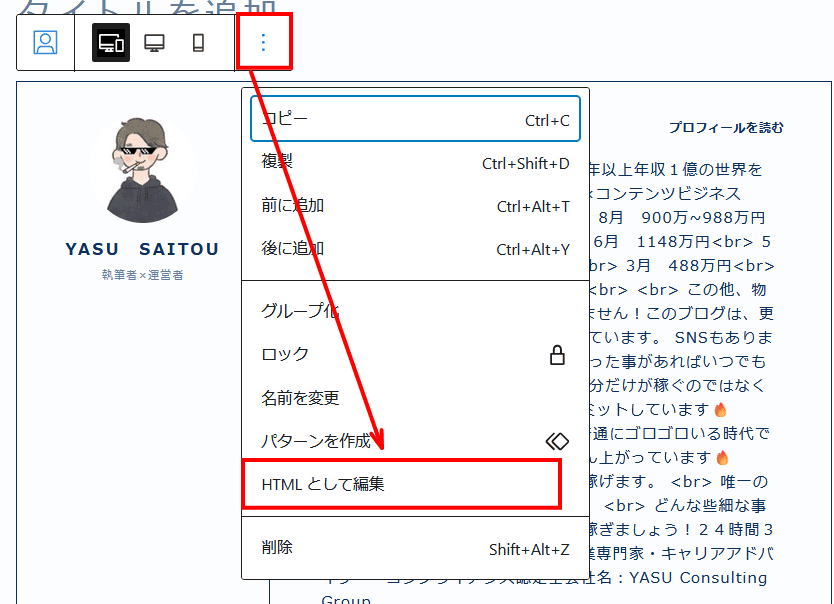 ブロックエディタの場合でも、プロフィールを入れたい場合、一旦挿入した後で、下記のようにブロックのメニューから、HTML編集をクリックすればHTML形式になります。