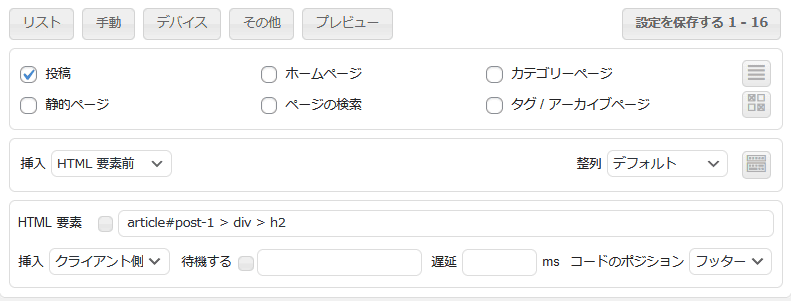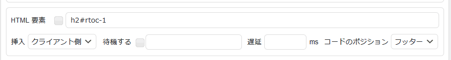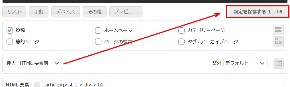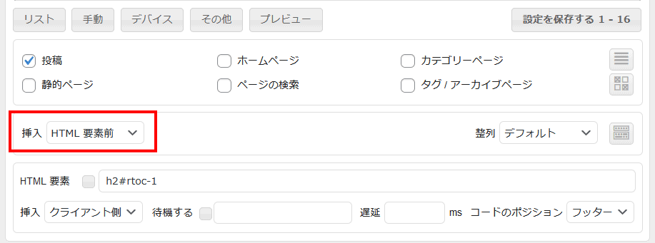 次に表示させる場所ですが、「h2の見出しの前」にする場合、一番正確なのは、 HTML要素前 です。