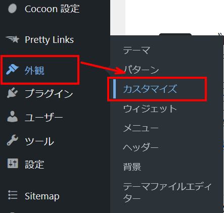 ワードプレスで外観⇒カスタマイズに移動をします。